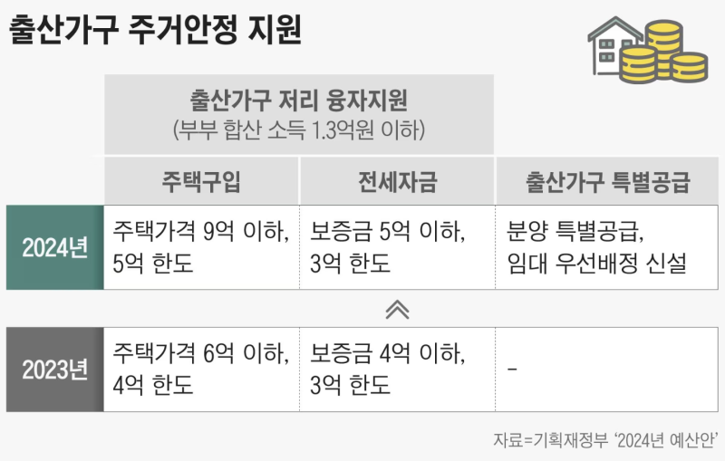 출산가구 특별공급 주택구입 전세자금의 소득요건이 완화돼요. 2023년에는 주택가액 6억 이하, 4억 한도 보증금 4억 이하, 3억 한도였는데, 2024년에는 주택가액 9억 이하, 5억 한도 보증급 5억 이하, 3억 한도로 확대된다고 해요.