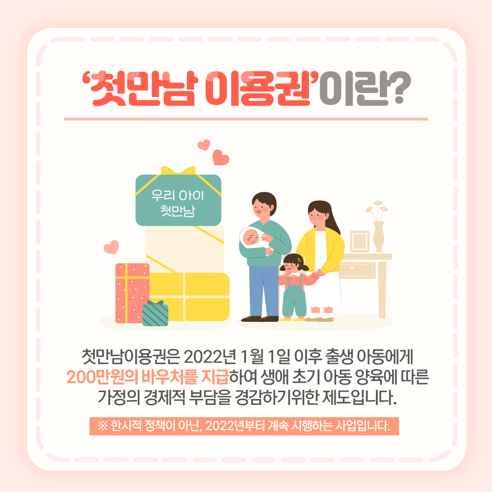 출산 시 모든 아동에게 200만 원의 바우처를 지급하는 제도예요. 사용처도 다양해서 아이를 키우는 데 필요한 물건을 사는 데 쓸 수 있어요.