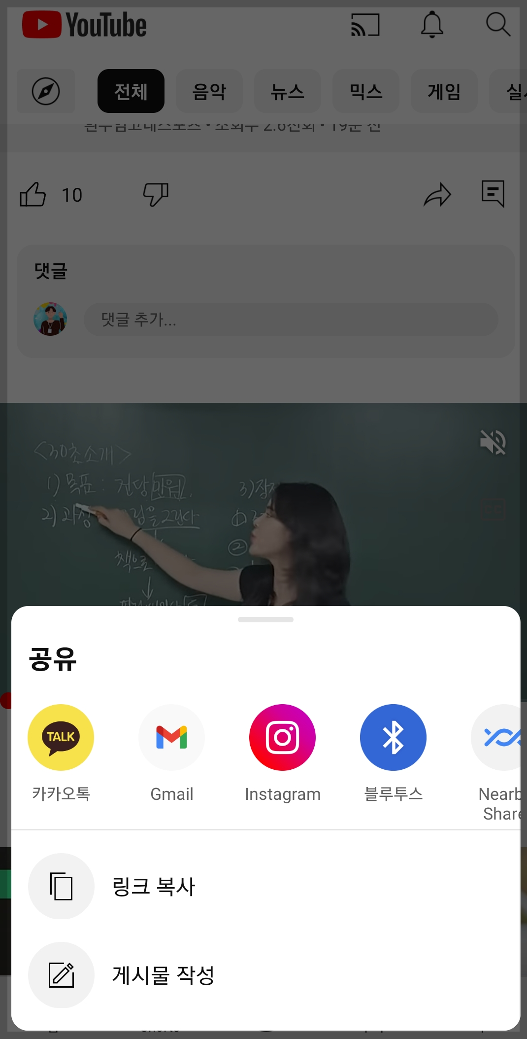 1. 먼저 유튜브에 들어가서 영상을 선택한 후에 공유하기 후, 링크복사를 눌러주세요.