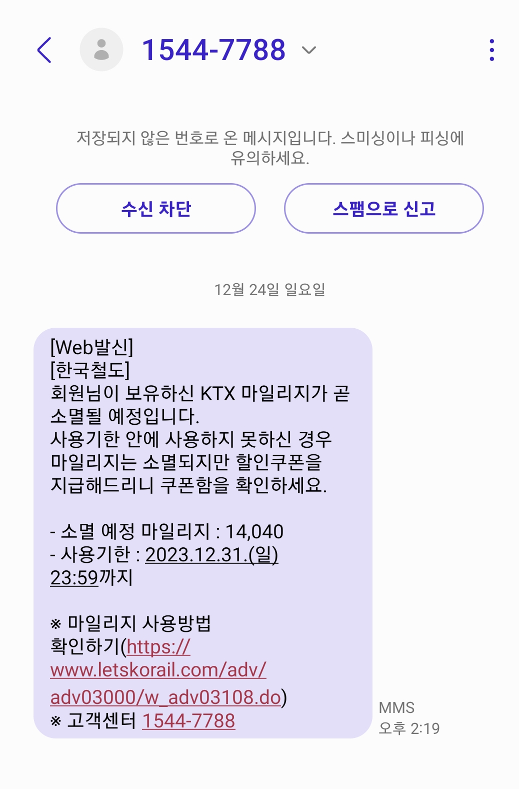 오늘 저에게 온 문자입니다. 한동안 출장으로 KTX와 SRT를 자주 이용했지만 최근엔 전국출장이 없다보니 포인트를 사용할 기회가 없었습니다. 그래서 오늘은 어떻게 하면 KTX마일리지를 사용할 수 있을지 소개해드리려고 합니다. 잘 따라오세요.