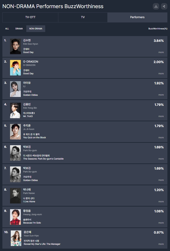 | 김수현, 압도적 화제성으로 비드라마 출연자 1위 석권! 👑 '굿데이' 효과 톡톡! G-DRAGON, 아이유, 박보검 등 톱스타 총출동! 🔥 (4) | 2025.03.18 |
