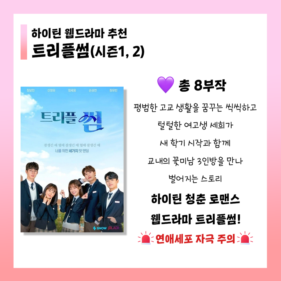 트리플썸 : 이 드라마는 고등학교를 배경으로 하며, 친구들 간의 복잡한 관계와 연애 금지의 상황을 그려내요.