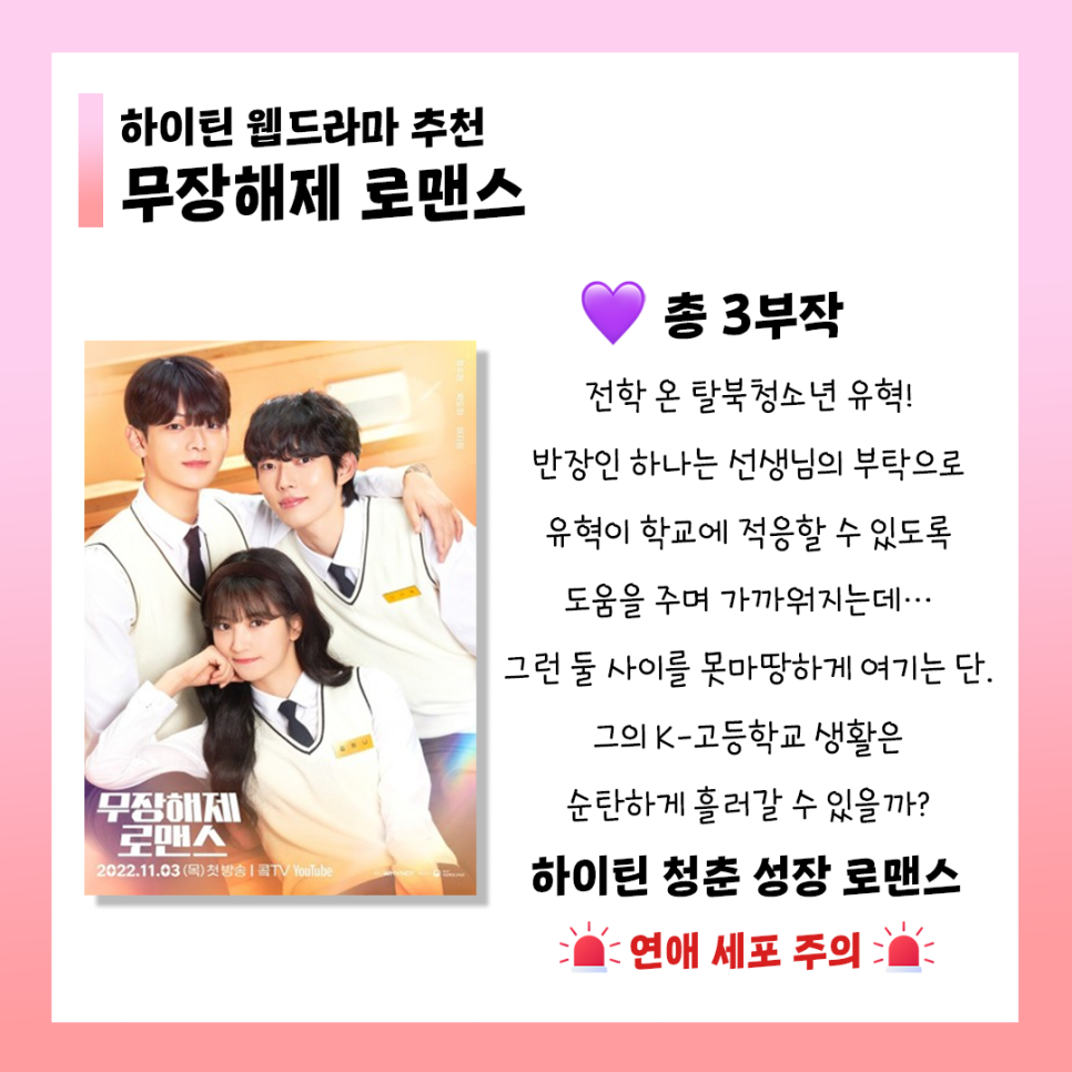 무장해제 로맨스 : 고등학생들의 이야기를 다룬 이 드라마는 연애 금지라는 설정 속에서 주인공들이 겪는 다양한 감정선이 매력적이에요.