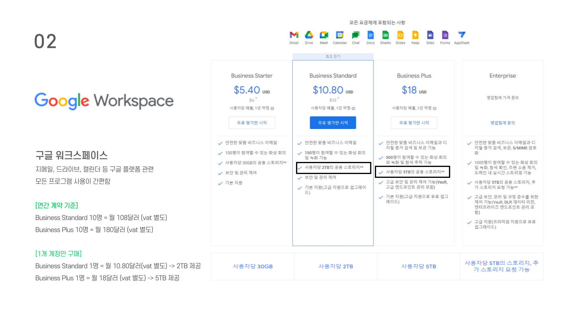 두번째 클라우드 서비스는 워크스페이스이다. 개인 사용자에게는 구글드라이브이며 전세계적인 서비스인 구글의 비즈니스 서비스여서 별다른 설명이 필요없다. 요금제는 3가지로 나누어져있다. 네이버웍스와 비교해서 비용은 조금 높아진다. 비즈니스 스탠다드의 경우에는 사용자당 2TB를 제공하며 비즈니스 플러스의 경우에는 인당 5TB를 제공한다. 비용은 네이버 웍스에 비해 높지만 구글 메일을 자주 이용하며 구글의 다른 서비스를 협업 플랫폼으로 활용하는 기업에게는 추천한다.