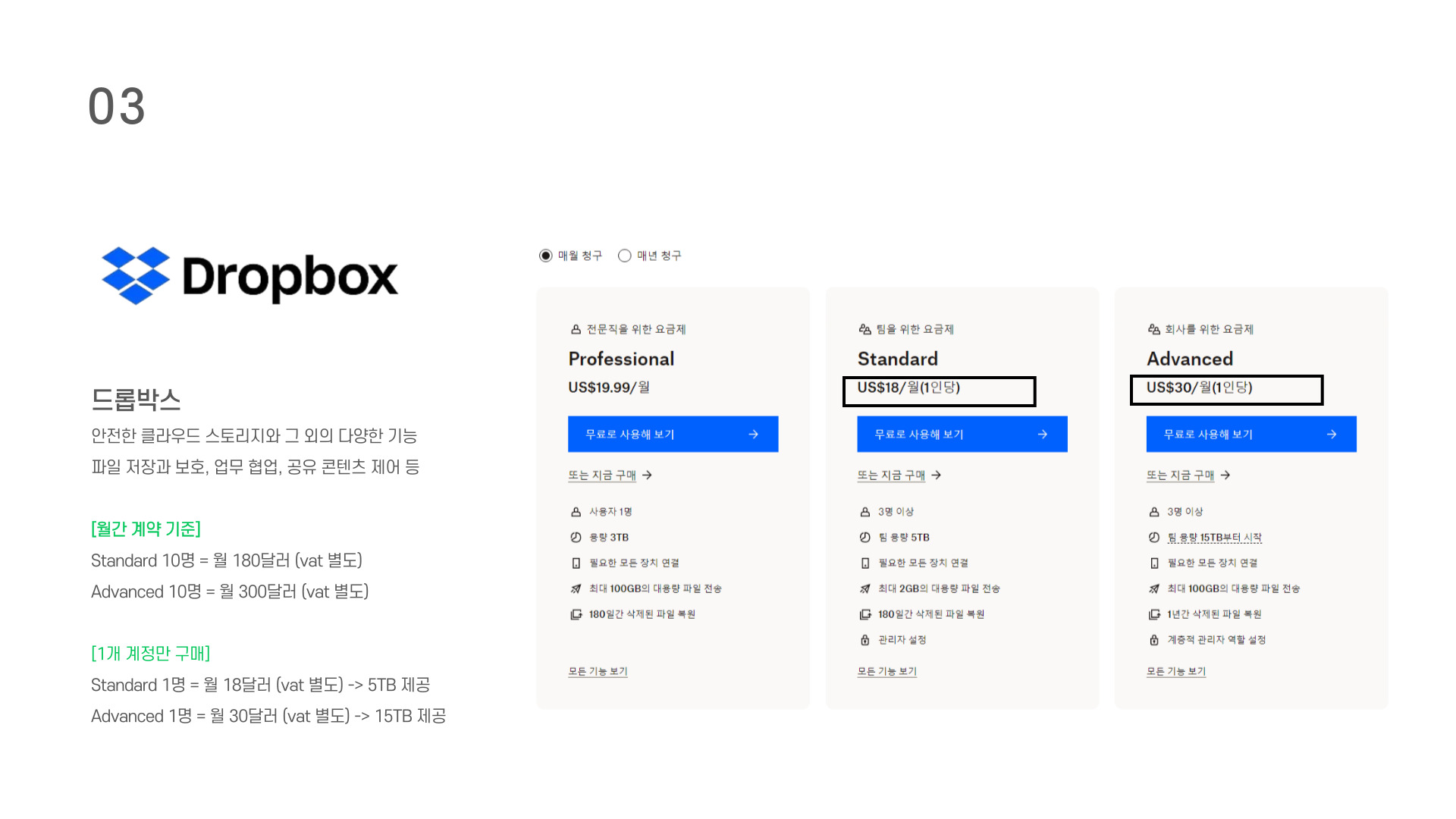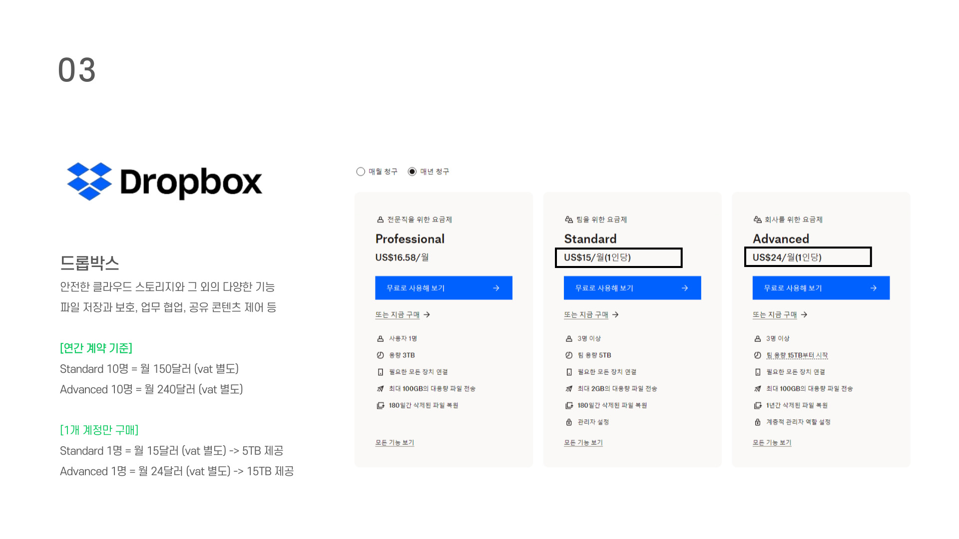 세번째 클라우드 서비스는 드롭박스이다. 드롭박스엔 기본적으로 4가지 요금제를 소개하고 있지만 저장 공간, 파일 공유에 특화된 요금제가 숨어있다. '드롭박스 요금제' 페이지 상단에 '더 많은 저장 공간이 필요하신가요? 요금제 보기'를 클릭하면 위의 이미지에 소개된 요금제를 볼 수 있다. 총 3가지 요금제를 소개하고 있는데 프로페셔널의 경우 공용용량이 3TB이고 스탠다드는 팀 용량 5TB, 어드밴스드의 경우 팀 용량이 15TB이며 인당 5TB를 제공한다. 어드밴스드의 경우, 회사를 위한 요금제라고 표시하고 있는데 최대 100GB의 대용량 파일을 한번에 전송이 가능하다. 또한 1년간 삭제된 파일 복원이 가능하다는 점이 차별화된 점이라 할 수 있다.