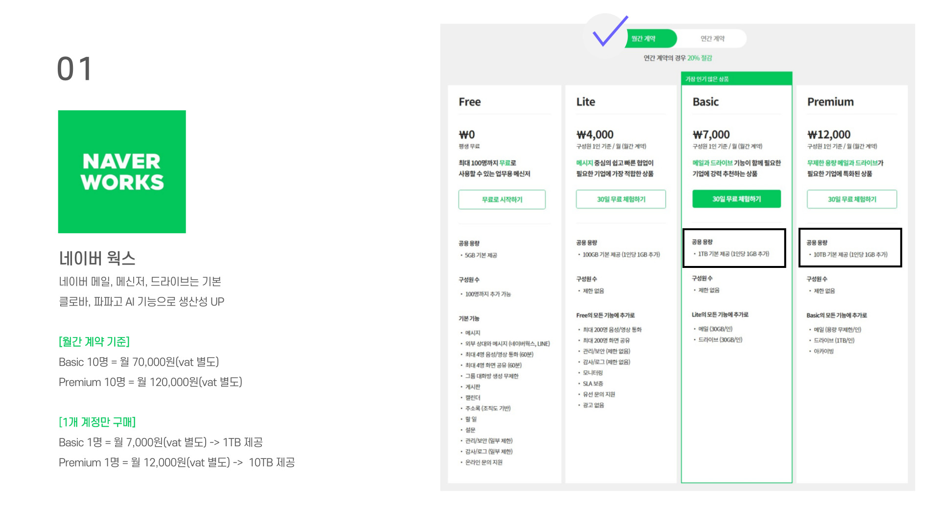 요금제는 총 4가지로 구성되어 있는데 흔히들 말하는 클라우드 서비스인 '드라이브'만 별도로 서비스하고 있지는 않고 메일, 메신저, 드라이브 등 서비스들이 하나로 묶어져 있다. 이 점은 일부 사용자들에게 아쉬운 점이긴 하다. 조금 더 가성비 있는 서비스가 나온다면 좋을 것 같다.